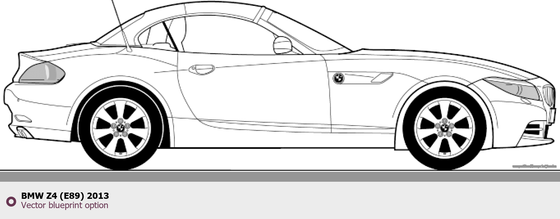 Raster blueprint of the 2013 BMW Z4 (E89) Tag. This free downloadable image can be used for graphic projects, digital design, and 3D modeling. The file provides accurate exterior proportions of the vehicle. Model year: 2013. Body type: Tag.