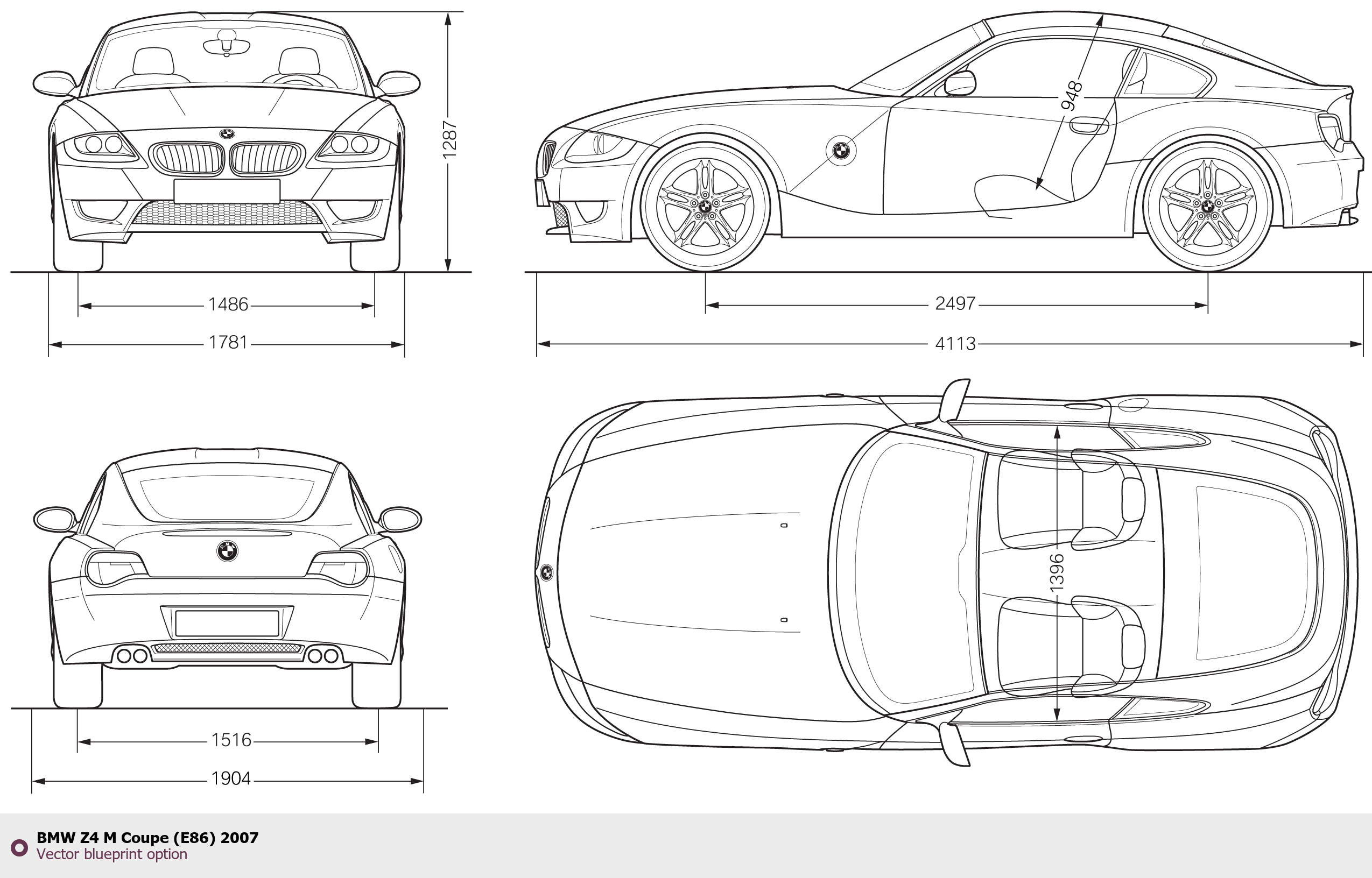 Raster blueprint of the 2007 BMW Z4 M Coupe (E86) Coupe. This free downloadable image can be used for graphic projects, digital design, and 3D modeling. The file provides accurate exterior proportions of the vehicle. Model year: 2007. Body type: Coupe.