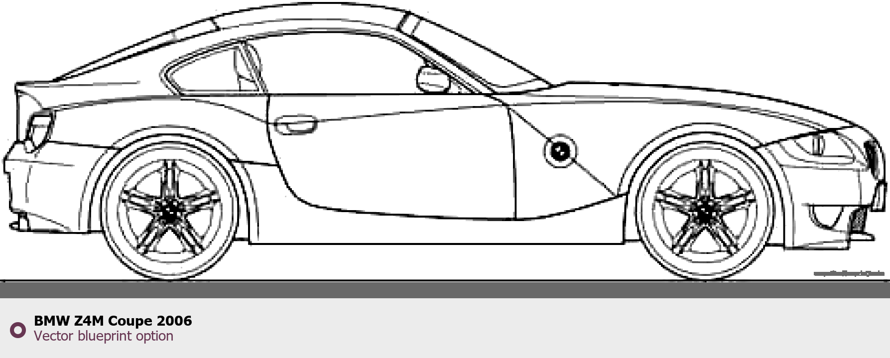Raster blueprint of the 2006 BMW Z4M Coupe Coupe. This free downloadable image can be used for graphic projects, digital design, and 3D modeling. The file provides accurate exterior proportions of the vehicle. Model year: 2006. Body type: Coupe.
