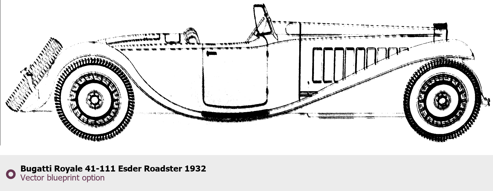Raster blueprint of the 1932 Bugatti Royale 41-111 Esder Roadster Roadster. This free downloadable image can be used for graphic projects, digital design, and 3D modeling. The file provides accurate exterior proportions of the vehicle. Model year: 1932. Body type: Roadster.