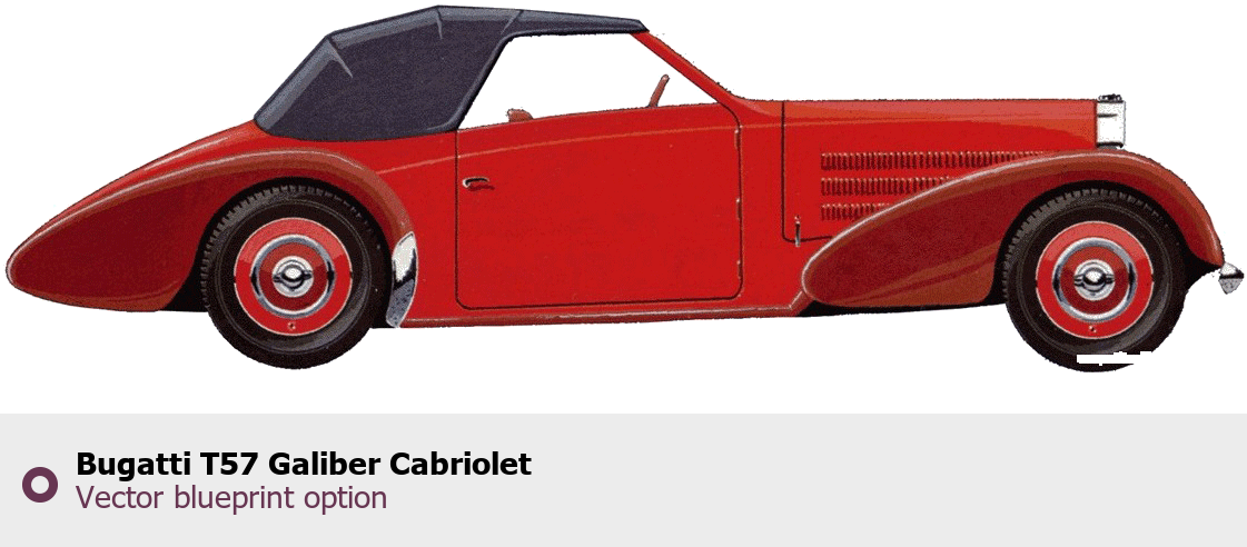 Raster blueprint of the Bugatti T57 Galiber Cabriolet Cabriolet. This free downloadable image can be used for graphic projects, digital design, and 3D modeling. The file provides accurate exterior proportions of the vehicle. Body type: Cabriolet.