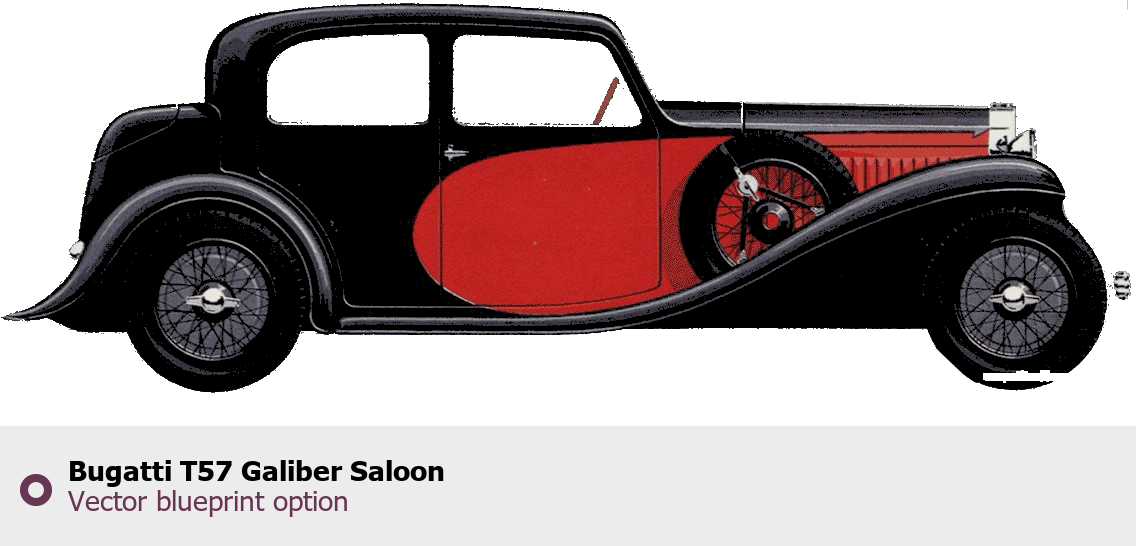 Raster blueprint of the Bugatti T57 Galiber Saloon Sedan. This free downloadable image can be used for graphic projects, digital design, and 3D modeling. The file provides accurate exterior proportions of the vehicle. Body type: Sedan.