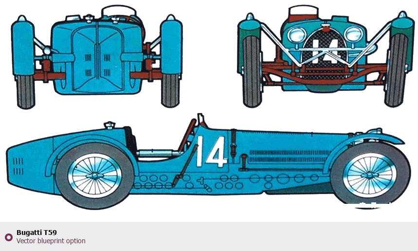 Raster blueprint of the Bugatti T59 Coupe. This free downloadable image can be used for graphic projects, digital design, and 3D modeling. The file provides accurate exterior proportions of the vehicle. Body type: Coupe.