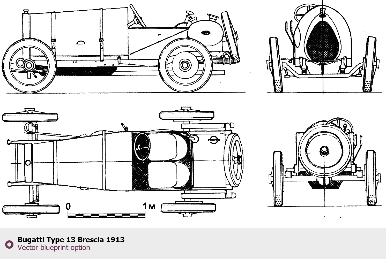 Raster blueprint of the 1913 Bugatti Type 13 Brescia Coupe. This free downloadable image can be used for graphic projects, digital design, and 3D modeling. The file provides accurate exterior proportions of the vehicle. Model year: 1913. Body type: Coupe.
