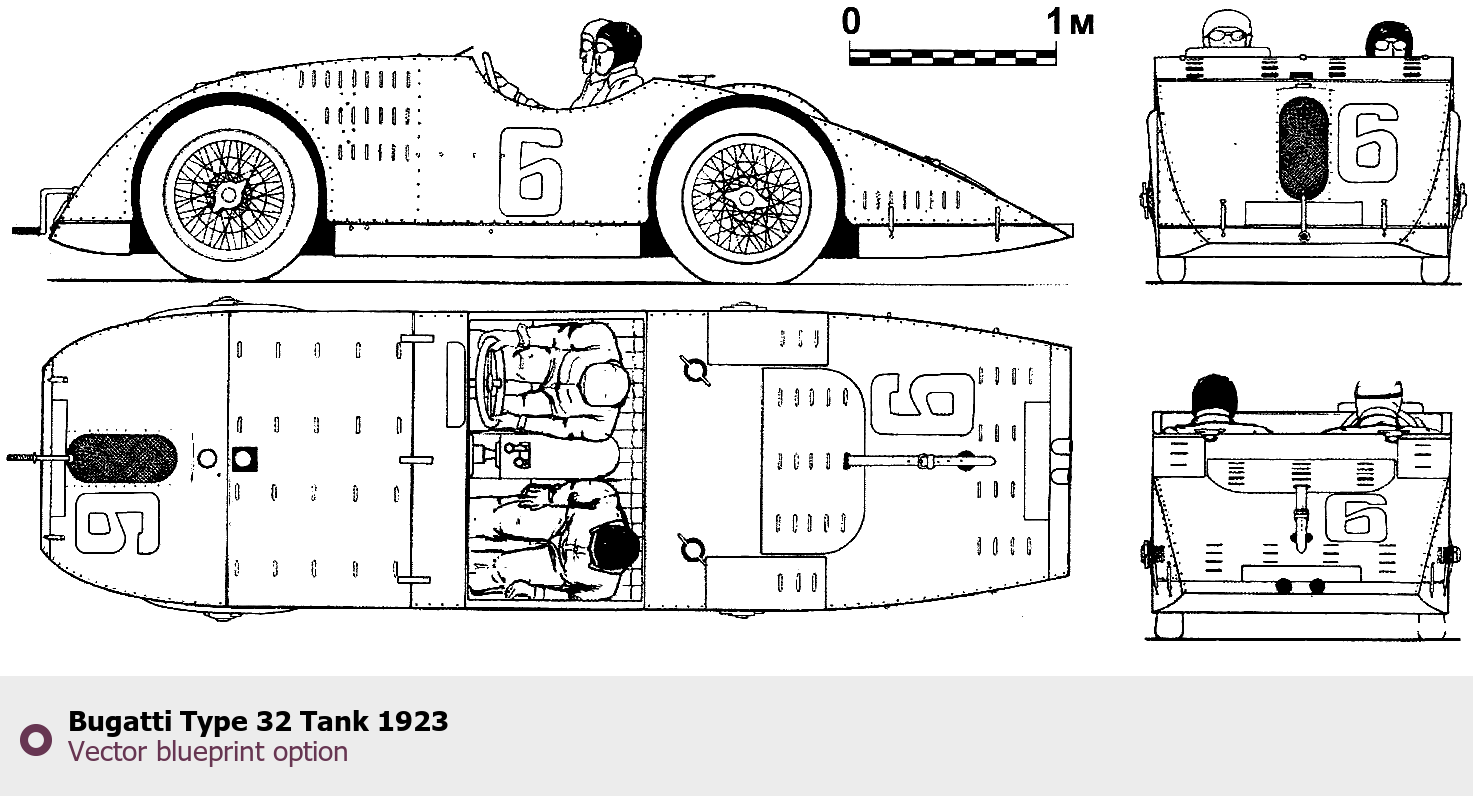 Raster blueprint of the 1923 Bugatti Type 32 Tank Coupe. This free downloadable image can be used for graphic projects, digital design, and 3D modeling. The file provides accurate exterior proportions of the vehicle. Model year: 1923. Body type: Coupe.