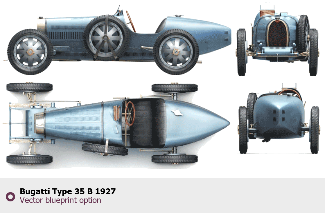 Raster blueprint of the 1927 Bugatti Type 35 B Formula. This free downloadable image can be used for graphic projects, digital design, and 3D modeling. The file provides accurate exterior proportions of the vehicle. Model year: 1927. Body type: Formula.