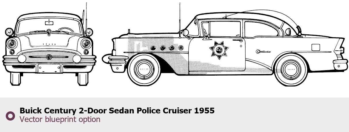 Raster blueprint of the 1955 Buick Century 2-Door Sedan Police Cruiser Sedan. This free downloadable image can be used for graphic projects, digital design, and 3D modeling. The file provides accurate exterior proportions of the vehicle. Model year: 1955. Body type: Sedan.