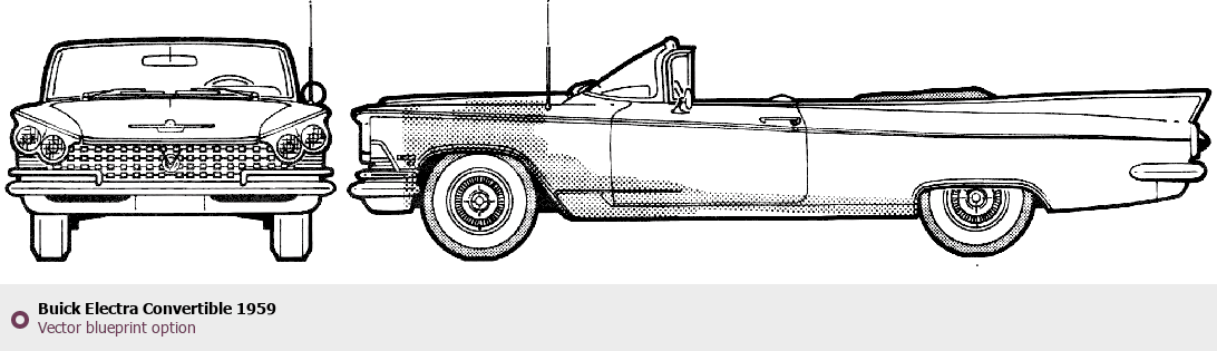 Raster blueprint of the 1959 Buick Electra Convertible Cabriolet. This free downloadable image can be used for graphic projects, digital design, and 3D modeling. The file provides accurate exterior proportions of the vehicle. Model year: 1959. Body type: Cabriolet.