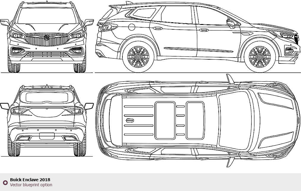 Raster blueprint of the 2018 Buick Enclave SUV. This free downloadable image can be used for graphic projects, digital design, and 3D modeling. The file provides accurate exterior proportions of the vehicle. Model year: 2018. Body type: SUV.