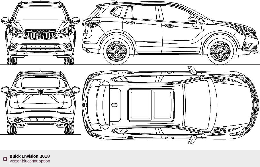 Raster blueprint of the 2018 Buick Envision SUV. This free downloadable image can be used for graphic projects, digital design, and 3D modeling. The file provides accurate exterior proportions of the vehicle. Model year: 2018. Body type: SUV.