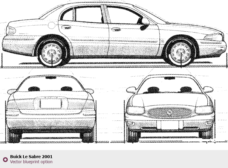 Raster blueprint of the 2001 Buick Le Sabre Tag. This free downloadable image can be used for graphic projects, digital design, and 3D modeling. The file provides accurate exterior proportions of the vehicle. Model year: 2001. Body type: Tag.