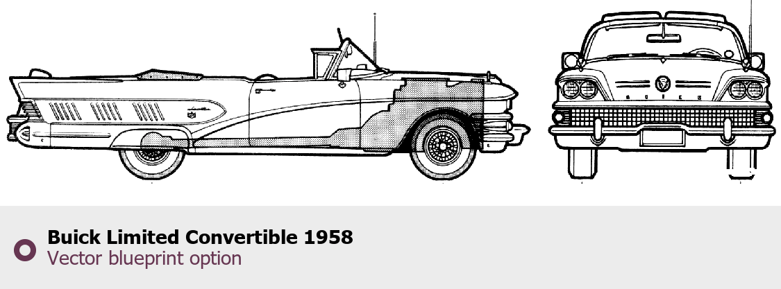 Raster blueprint of the 1958 Buick Limited Convertible Cabriolet. This free downloadable image can be used for graphic projects, digital design, and 3D modeling. The file provides accurate exterior proportions of the vehicle. Model year: 1958. Body type: Cabriolet.