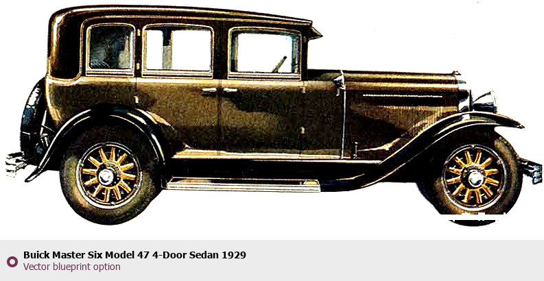 Raster blueprint of the 1929 Buick Master Six Model 47 4-Door Sedan Sedan. This free downloadable image can be used for graphic projects, digital design, and 3D modeling. The file provides accurate exterior proportions of the vehicle. Model year: 1929. Body type: Sedan.