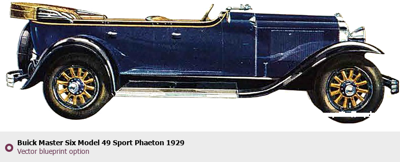 Raster blueprint of the 1929 Buick Master Six Model 49 Sport Phaeton Phaeton. This free downloadable image can be used for graphic projects, digital design, and 3D modeling. The file provides accurate exterior proportions of the vehicle. Model year: 1929. Body type: Phaeton.