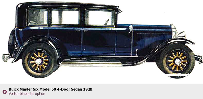Raster blueprint of the 1929 Buick Master Six Model 50 4-Door Sedan Sedan. This free downloadable image can be used for graphic projects, digital design, and 3D modeling. The file provides accurate exterior proportions of the vehicle. Model year: 1929. Body type: Sedan.