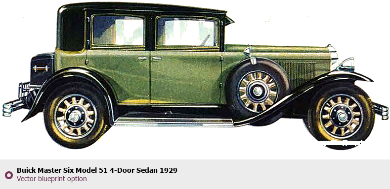 Raster blueprint of the 1929 Buick Master Six Model 51 4-Door Sedan Sedan. This free downloadable image can be used for graphic projects, digital design, and 3D modeling. The file provides accurate exterior proportions of the vehicle. Model year: 1929. Body type: Sedan.