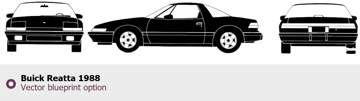 Raster blueprint of the 1988 Buick Reatta Tag. This free downloadable image can be used for graphic projects, digital design, and 3D modeling. The file provides accurate exterior proportions of the vehicle. Model year: 1988. Body type: Tag.