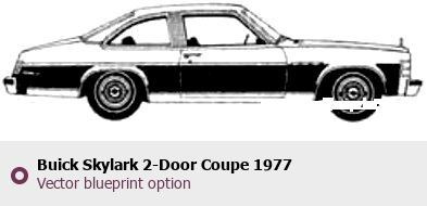 Raster blueprint of the 1977 Buick Skylark 2-Door Coupe Coupe. This free downloadable image can be used for graphic projects, digital design, and 3D modeling. The file provides accurate exterior proportions of the vehicle. Model year: 1977. Body type: Coupe.