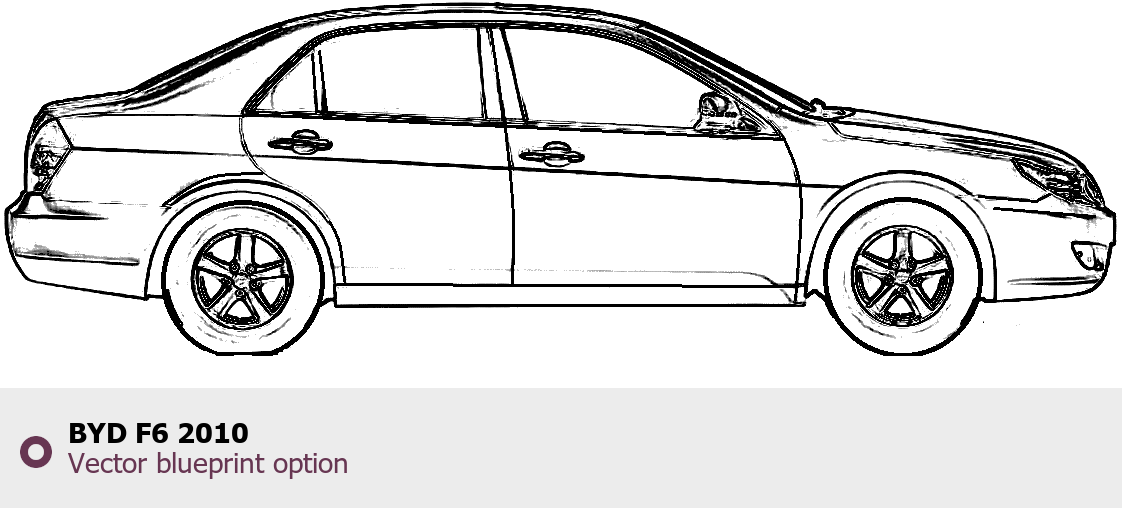 Raster blueprint of the 2010 BYD F6 Sedan. This free downloadable image can be used for graphic projects, digital design, and 3D modeling. The file provides accurate exterior proportions of the vehicle. Model year: 2010. Body type: Sedan.