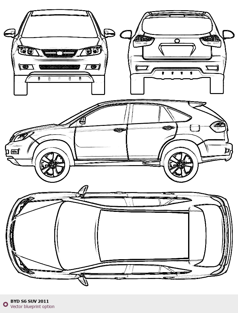 Raster blueprint of the 2011 BYD S6 SUV SUV. This free downloadable image can be used for graphic projects, digital design, and 3D modeling. The file provides accurate exterior proportions of the vehicle. Model year: 2011. Body type: SUV.