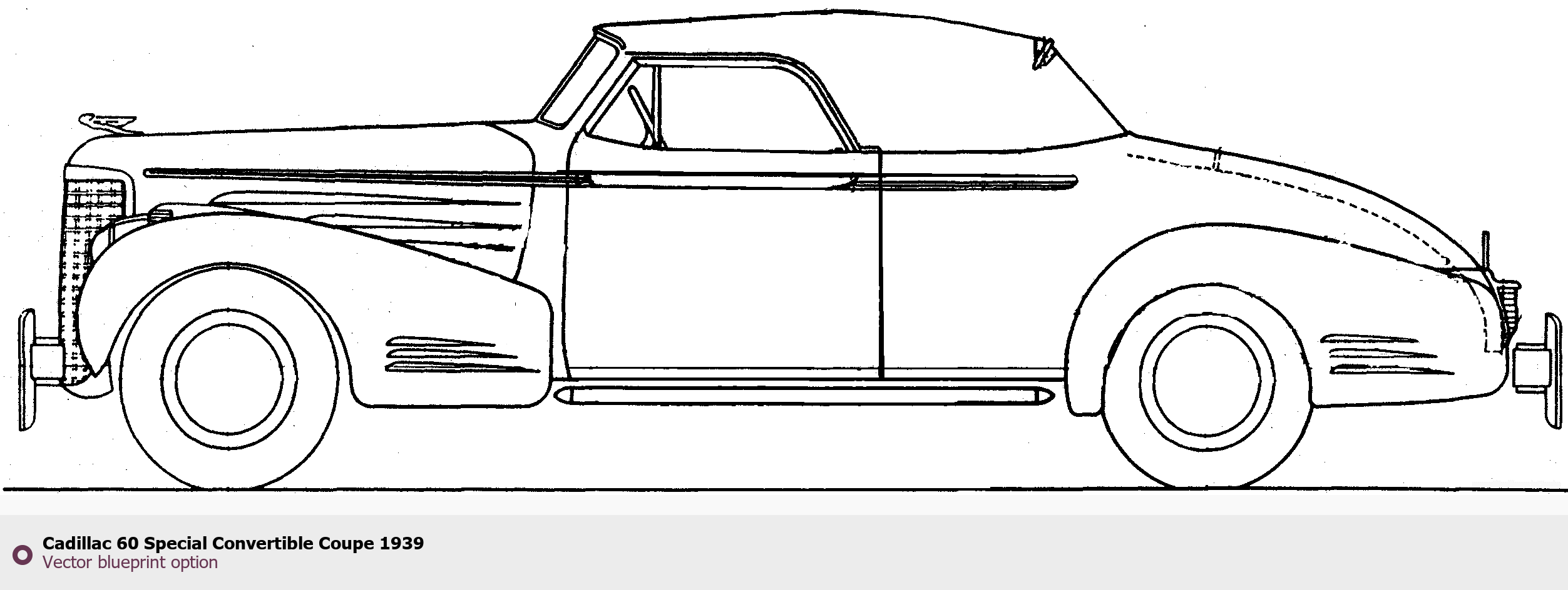 Raster blueprint of the 1939 Cadillac 60 Special Convertible Coupe Coupe. This free downloadable image can be used for graphic projects, digital design, and 3D modeling. The file provides accurate exterior proportions of the vehicle. Model year: 1939. Body type: Coupe.