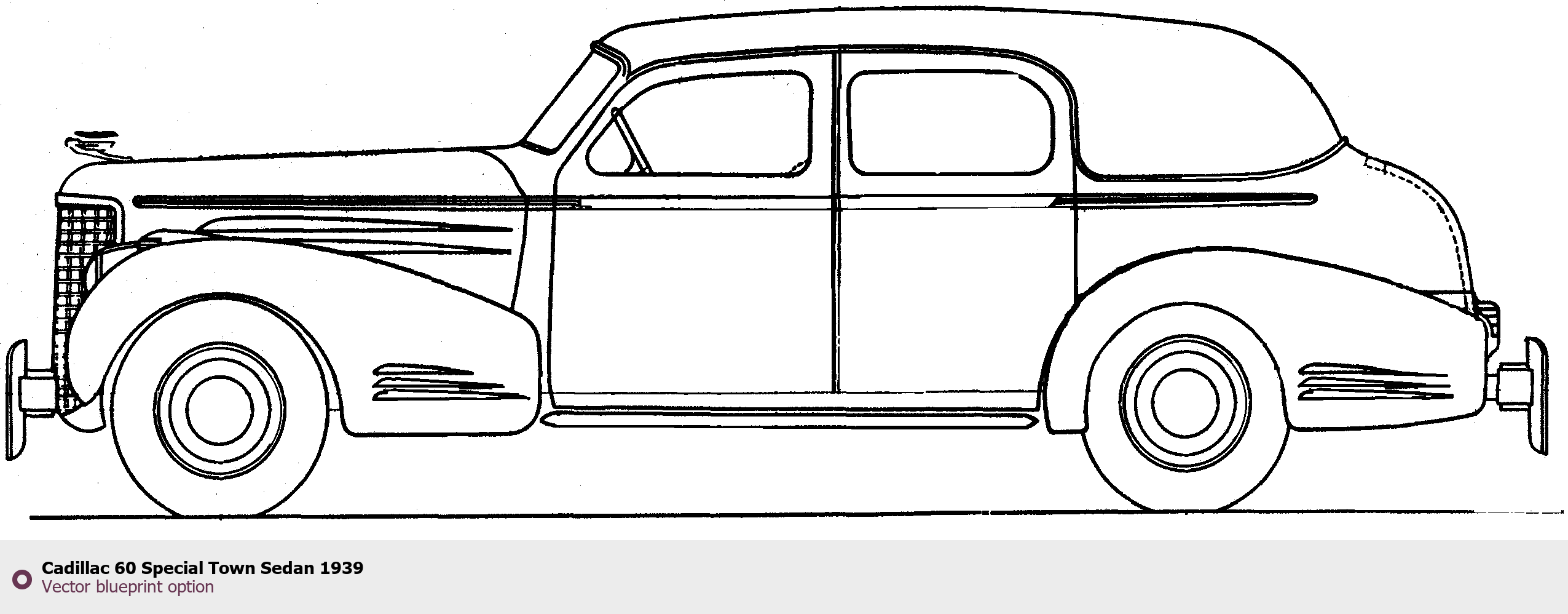 Raster blueprint of the 1939 Cadillac 60 Special Town Sedan Sedan. This free downloadable image can be used for graphic projects, digital design, and 3D modeling. The file provides accurate exterior proportions of the vehicle. Model year: 1939. Body type: Sedan.