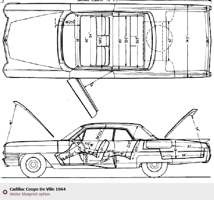 Raster blueprint of the 1964 Cadillac Coupe De Ville Coupe. This free downloadable image can be used for graphic projects, digital design, and 3D modeling. The file provides accurate exterior proportions of the vehicle. Model year: 1964. Body type: Coupe.