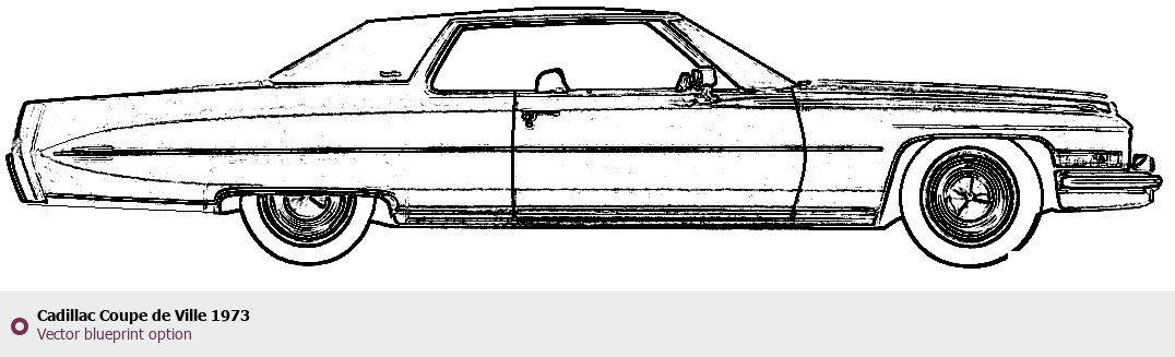 Raster blueprint of the 1973 Cadillac Coupe de Ville Coupe. This free downloadable image can be used for graphic projects, digital design, and 3D modeling. The file provides accurate exterior proportions of the vehicle. Model year: 1973. Body type: Coupe.