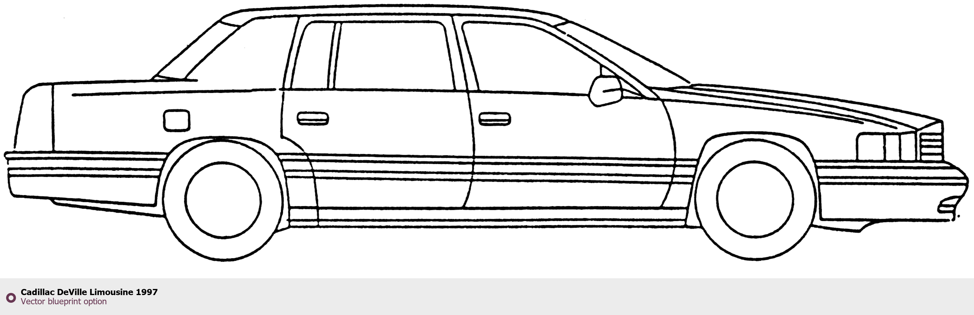 Raster blueprint of the 1997 Cadillac DeVille Limousine Limousine. This free downloadable image can be used for graphic projects, digital design, and 3D modeling. The file provides accurate exterior proportions of the vehicle. Model year: 1997. Body type: Limousine.
