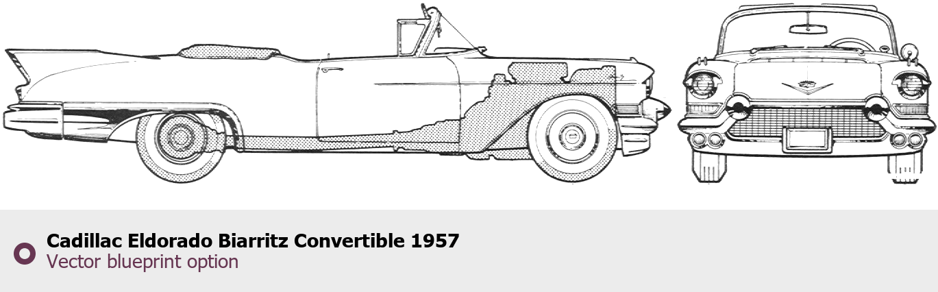 Raster blueprint of the 1957 Cadillac Eldorado Biarritz Convertible Cabriolet. This free downloadable image can be used for graphic projects, digital design, and 3D modeling. The file provides accurate exterior proportions of the vehicle. Model year: 1957. Body type: Cabriolet.