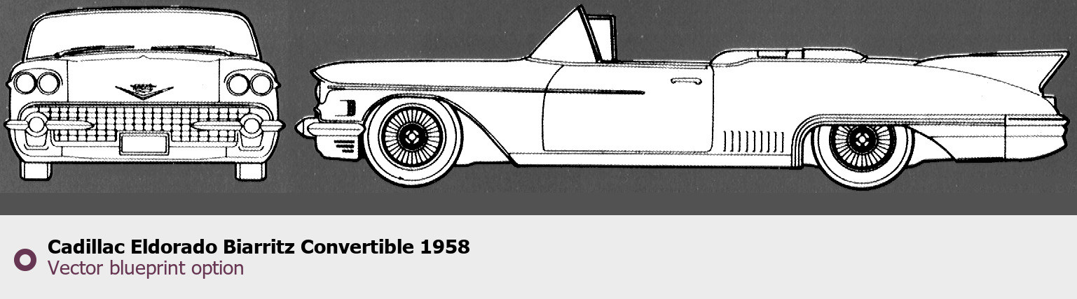 Raster blueprint of the 1958 Cadillac Eldorado Biarritz Convertible Cabriolet. This free downloadable image can be used for graphic projects, digital design, and 3D modeling. The file provides accurate exterior proportions of the vehicle. Model year: 1958. Body type: Cabriolet.