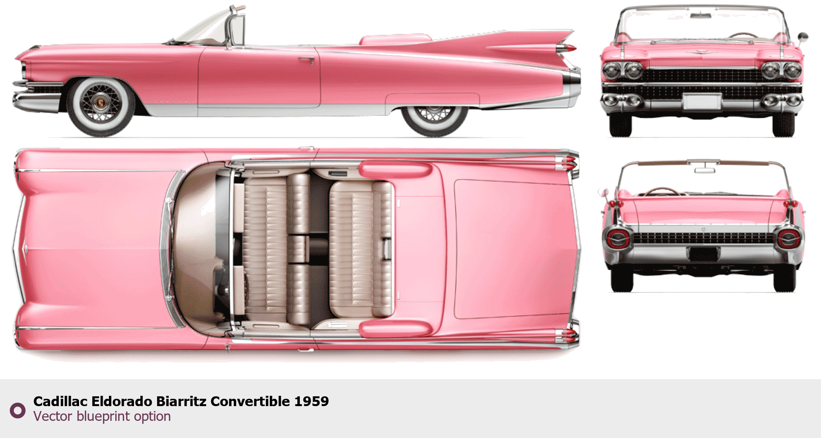 Raster blueprint of the 1959 Cadillac Eldorado Biarritz Convertible Cabriolet. This free downloadable image can be used for graphic projects, digital design, and 3D modeling. The file provides accurate exterior proportions of the vehicle. Model year: 1959. Body type: Cabriolet.