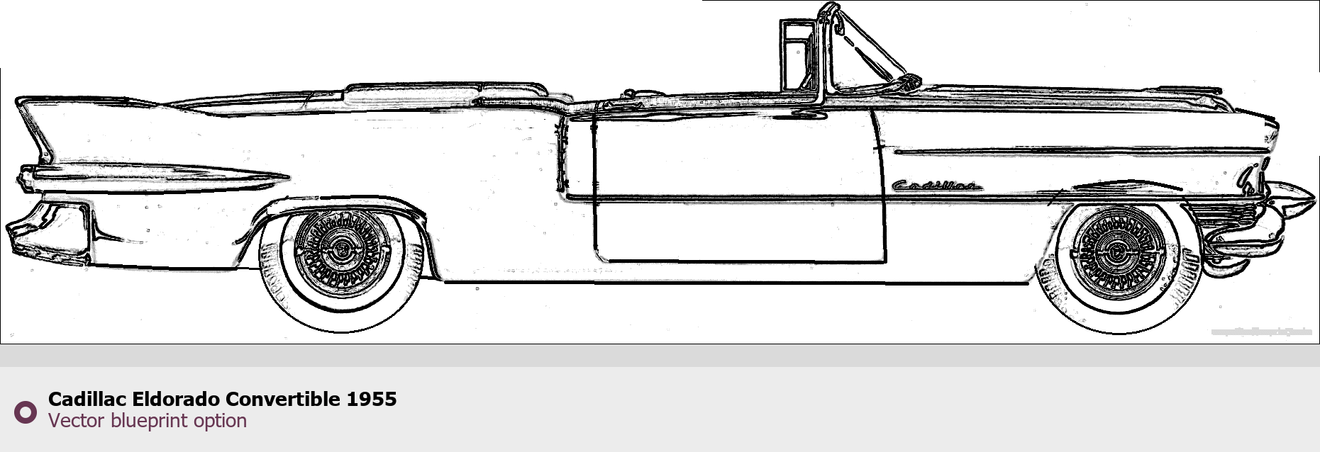 Raster blueprint of the 1955 Cadillac Eldorado Convertible Cabriolet. This free downloadable image can be used for graphic projects, digital design, and 3D modeling. The file provides accurate exterior proportions of the vehicle. Model year: 1955. Body type: Cabriolet.