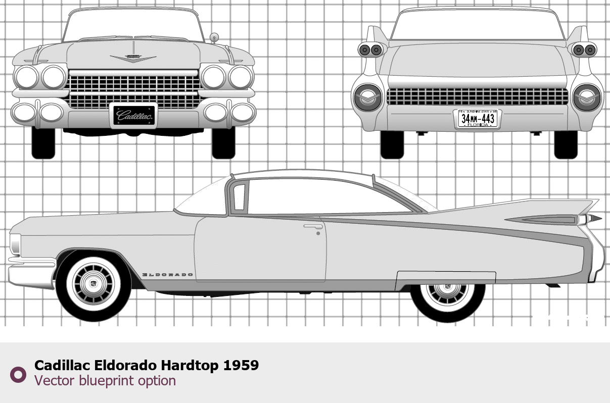 Raster blueprint of the 1959 Cadillac Eldorado Hardtop Tag. This free downloadable image can be used for graphic projects, digital design, and 3D modeling. The file provides accurate exterior proportions of the vehicle. Model year: 1959. Body type: Tag.