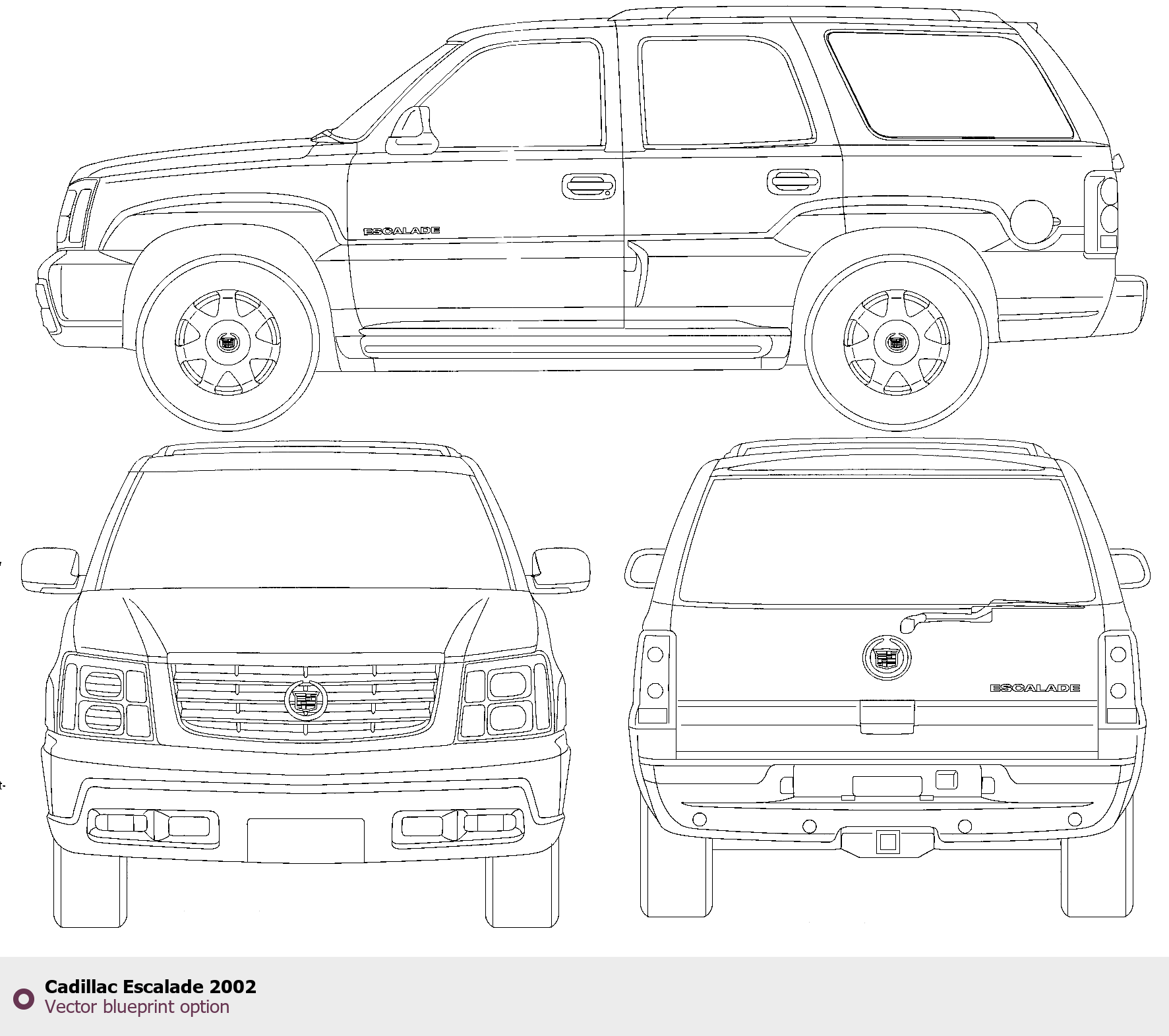 Raster blueprint of the 2002 Cadillac Escalade SUV. This free downloadable image can be used for graphic projects, digital design, and 3D modeling. The file provides accurate exterior proportions of the vehicle. Model year: 2002. Body type: SUV.