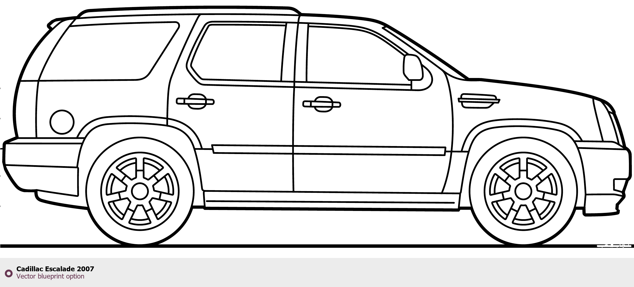 Raster blueprint of the 2007 Cadillac Escalade SUV. This free downloadable image can be used for graphic projects, digital design, and 3D modeling. The file provides accurate exterior proportions of the vehicle. Model year: 2007. Body type: SUV.