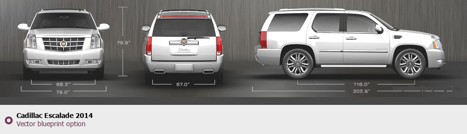 Raster blueprint of the 2014 Cadillac Escalade SUV. This free downloadable image can be used for graphic projects, digital design, and 3D modeling. The file provides accurate exterior proportions of the vehicle. Model year: 2014. Body type: SUV.