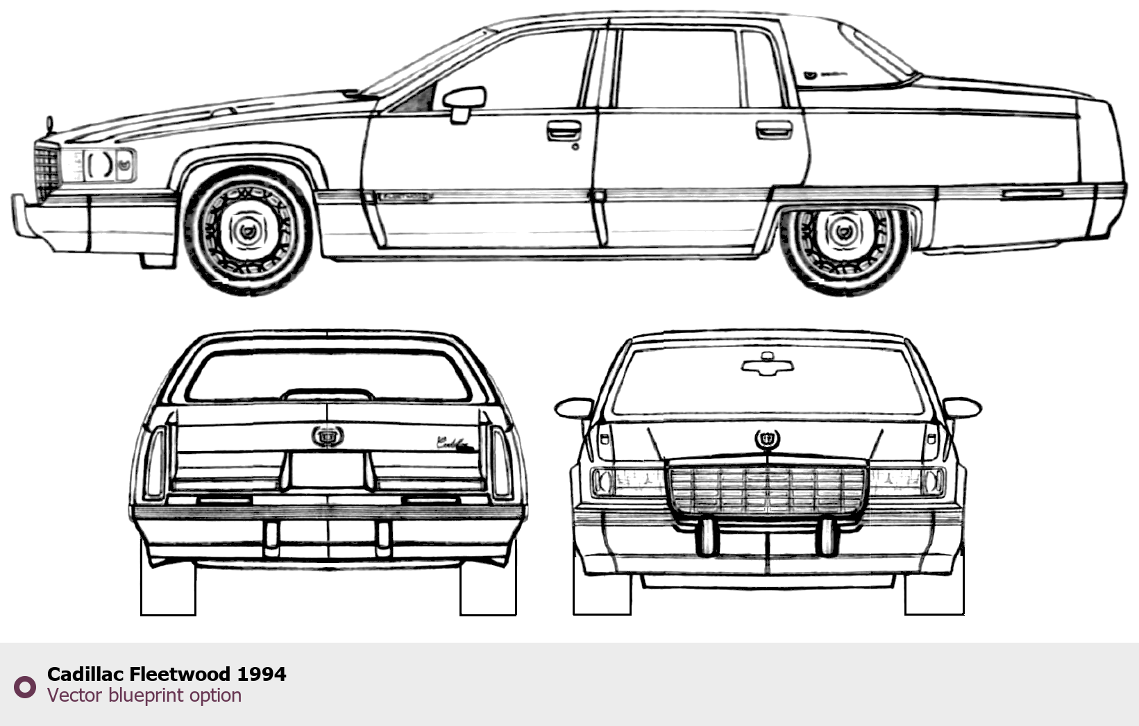 Raster blueprint of the 1994 Cadillac Fleetwood Tag. This free downloadable image can be used for graphic projects, digital design, and 3D modeling. The file provides accurate exterior proportions of the vehicle. Model year: 1994. Body type: Tag.
