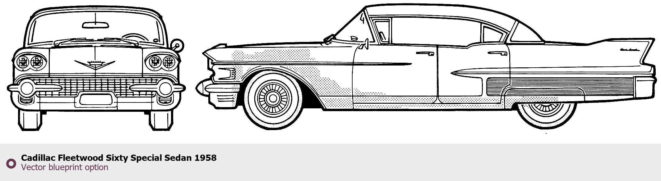 Raster blueprint of the 1958 Cadillac Fleetwood Sixty Special Sedan Sedan. This free downloadable image can be used for graphic projects, digital design, and 3D modeling. The file provides accurate exterior proportions of the vehicle. Model year: 1958. Body type: Sedan.