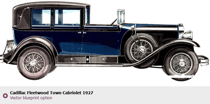 Raster blueprint of the 1927 Cadillac Fleetwood Town Cabriolet Cabriolet. This free downloadable image can be used for graphic projects, digital design, and 3D modeling. The file provides accurate exterior proportions of the vehicle. Model year: 1927. Body type: Cabriolet.