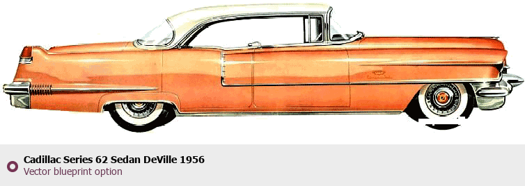Raster blueprint of the 1956 Cadillac Series 62 Sedan DeVille Sedan. This free downloadable image can be used for graphic projects, digital design, and 3D modeling. The file provides accurate exterior proportions of the vehicle. Model year: 1956. Body type: Sedan.