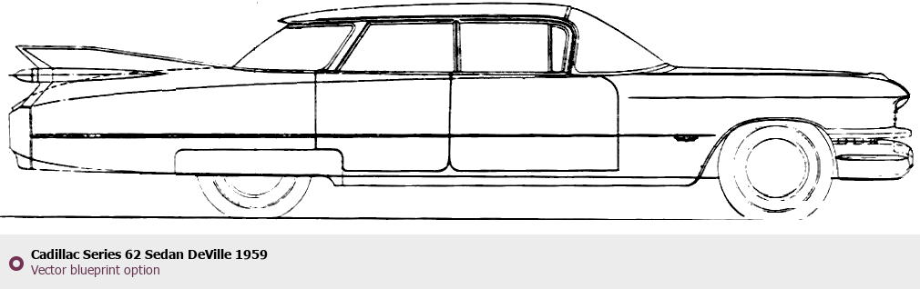 Raster blueprint of the 1959 Cadillac Series 62 Sedan DeVille Sedan. This free downloadable image can be used for graphic projects, digital design, and 3D modeling. The file provides accurate exterior proportions of the vehicle. Model year: 1959. Body type: Sedan.