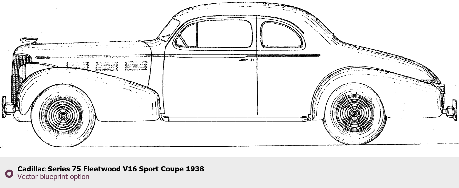 Raster blueprint of the 1938 Cadillac Series 75 Fleetwood V16 Sport Coupe Coupe. This free downloadable image can be used for graphic projects, digital design, and 3D modeling. The file provides accurate exterior proportions of the vehicle. Model year: 1938. Body type: Coupe.