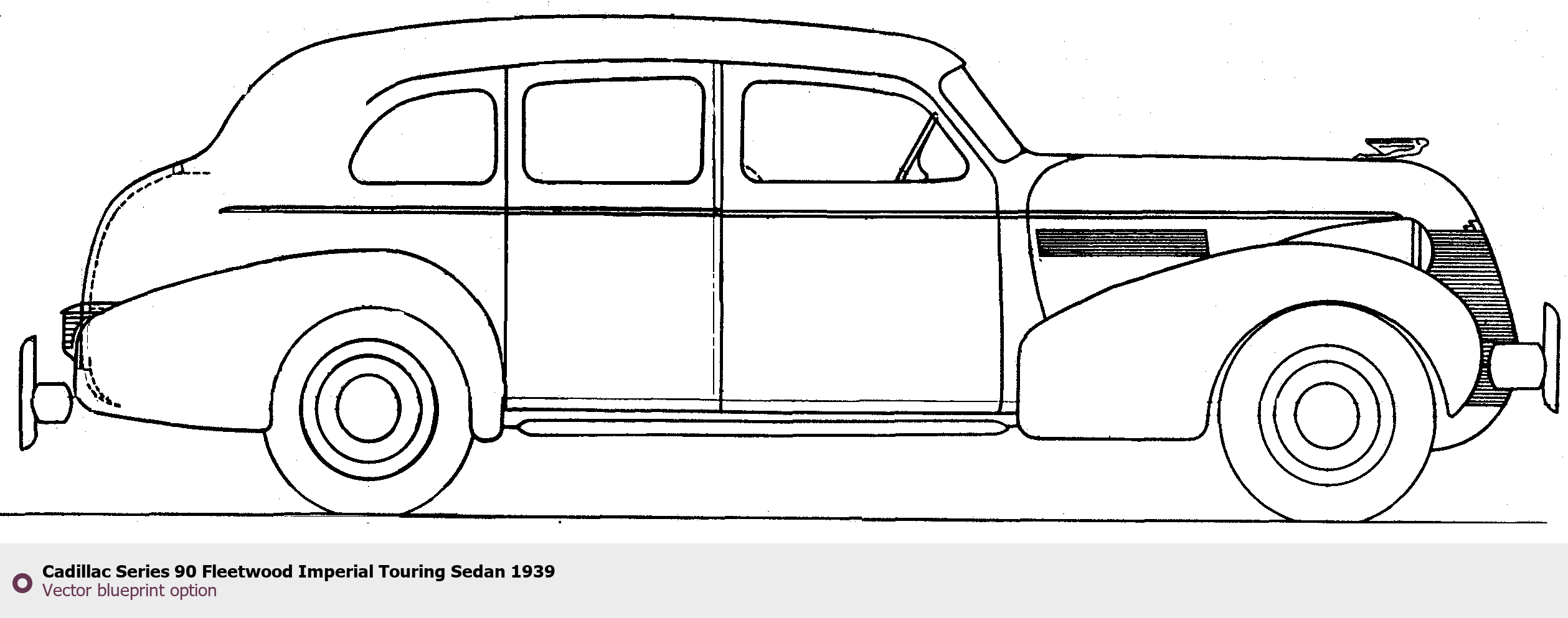 Raster blueprint of the 1939 Cadillac Series 90 Fleetwood Imperial Touring Sedan Sedan. This free downloadable image can be used for graphic projects, digital design, and 3D modeling. The file provides accurate exterior proportions of the vehicle. Model year: 1939. Body type: Sedan.