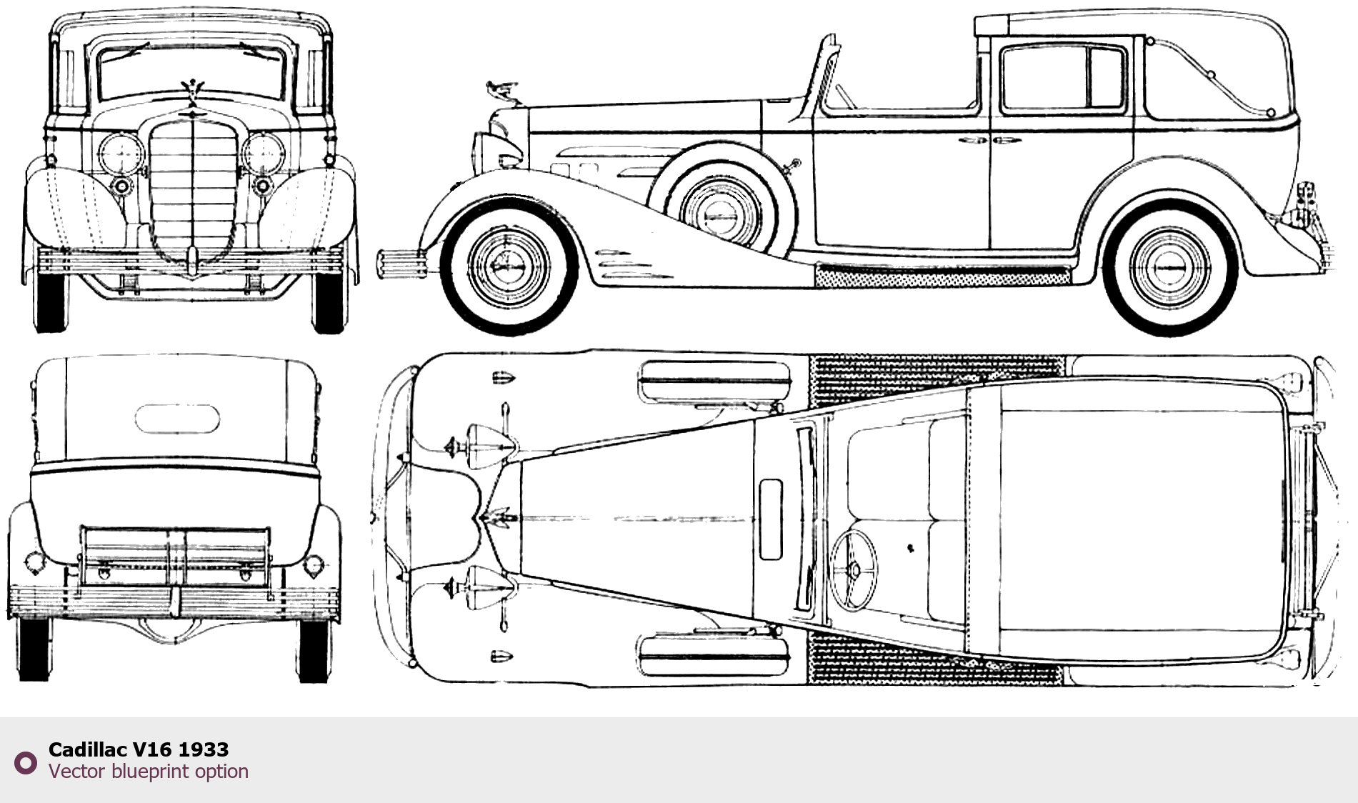 Raster blueprint of the 1933 Cadillac V16 Tag. This free downloadable image can be used for graphic projects, digital design, and 3D modeling. The file provides accurate exterior proportions of the vehicle. Model year: 1933. Body type: Tag.