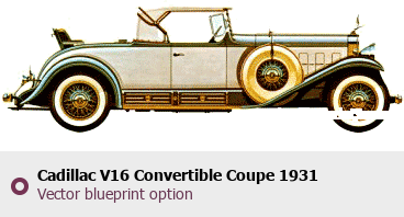 Raster blueprint of the 1931 Cadillac V16 Convertible Coupe Coupe. This free downloadable image can be used for graphic projects, digital design, and 3D modeling. The file provides accurate exterior proportions of the vehicle. Model year: 1931. Body type: Coupe.