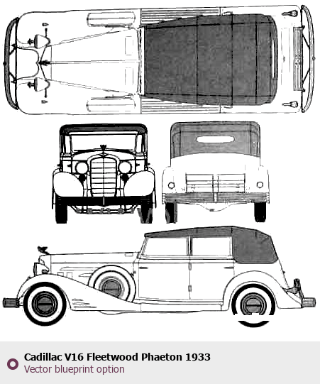 Raster blueprint of the 1933 Cadillac V16 Fleetwood Phaeton Phaeton. This free downloadable image can be used for graphic projects, digital design, and 3D modeling. The file provides accurate exterior proportions of the vehicle. Model year: 1933. Body type: Phaeton.