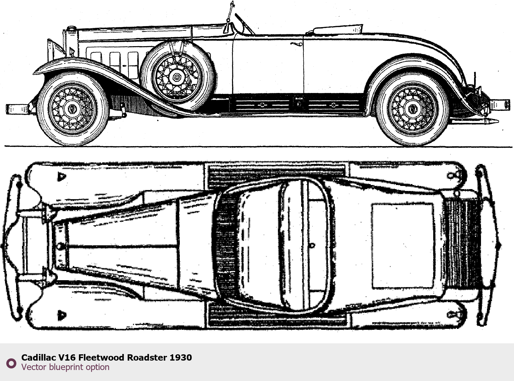 Raster blueprint of the 1930 Cadillac V16 Fleetwood Roadster Roadster. This free downloadable image can be used for graphic projects, digital design, and 3D modeling. The file provides accurate exterior proportions of the vehicle. Model year: 1930. Body type: Roadster.