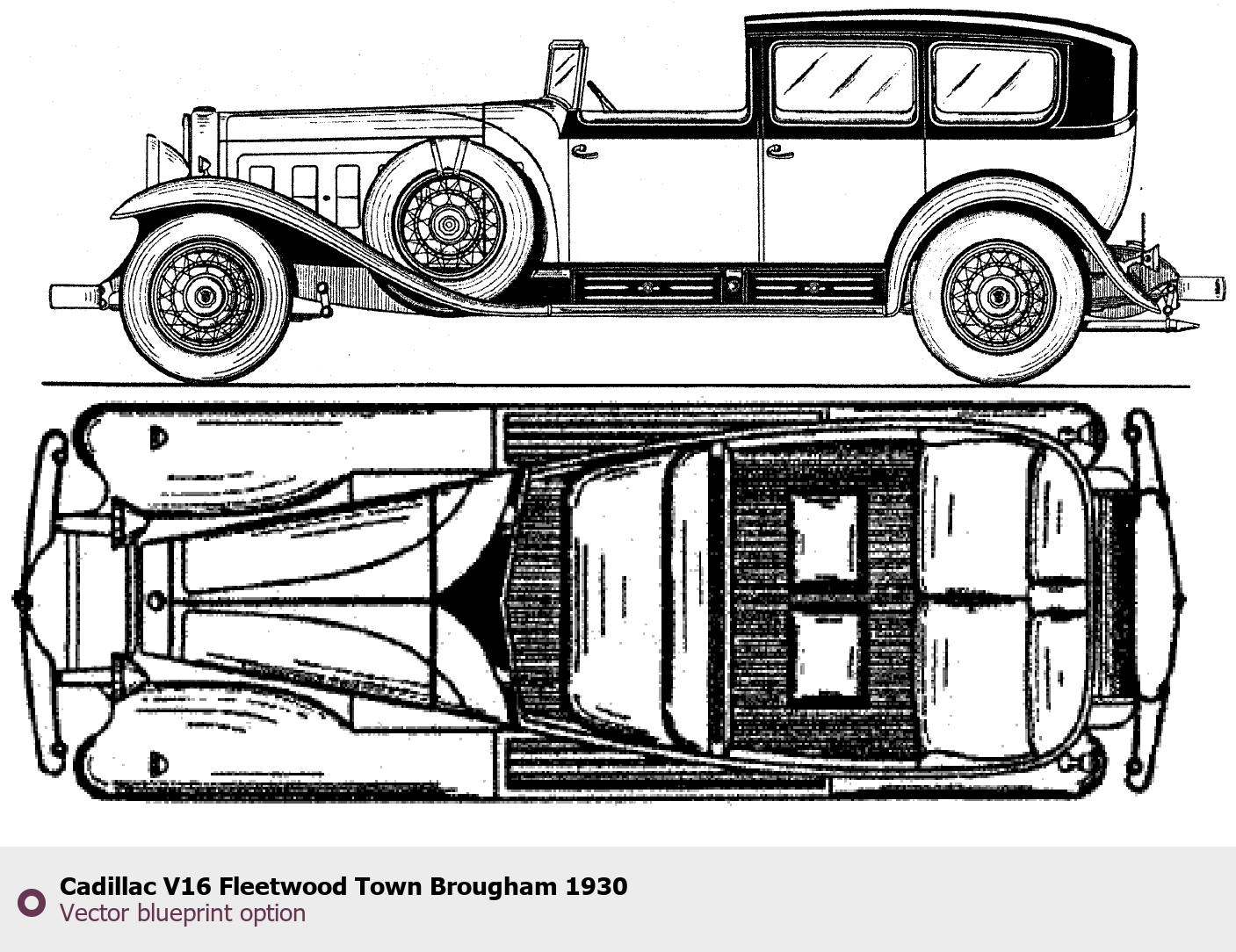 Raster blueprint of the 1930 Cadillac V16 Fleetwood Town Brougham Tag. This free downloadable image can be used for graphic projects, digital design, and 3D modeling. The file provides accurate exterior proportions of the vehicle. Model year: 1930. Body type: Tag.