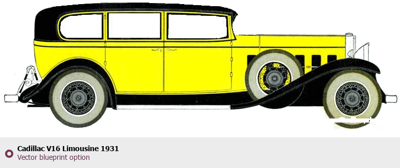 Raster blueprint of the 1931 Cadillac V16 Limousine Limousine. This free downloadable image can be used for graphic projects, digital design, and 3D modeling. The file provides accurate exterior proportions of the vehicle. Model year: 1931. Body type: Limousine.